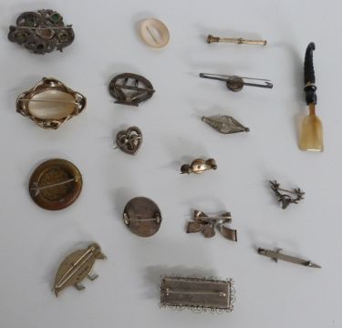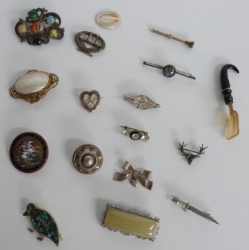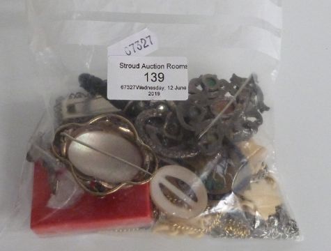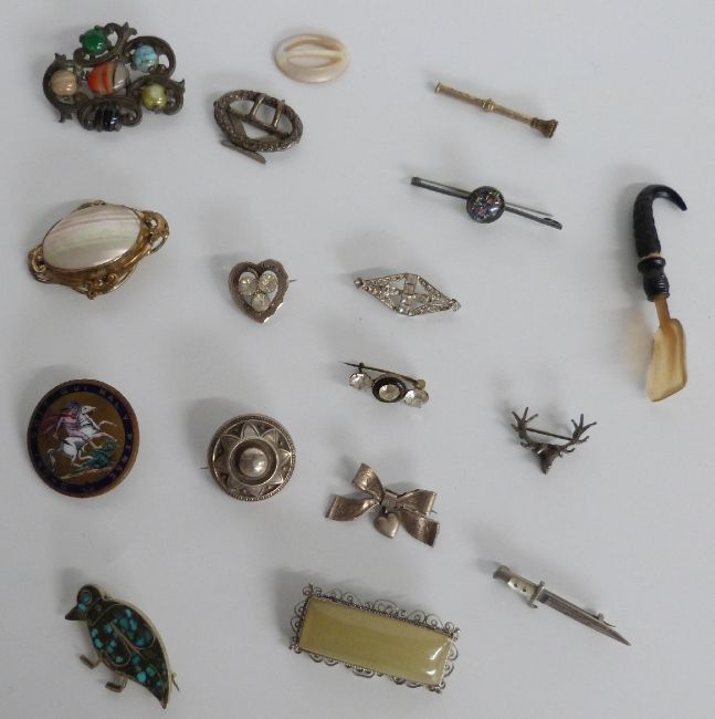 A collection of jewellery including Victorian silver brooches, Victorian brooch set with mother of pearl, lace agate pendant, butterfly wing brooch, Miracle pendant etc