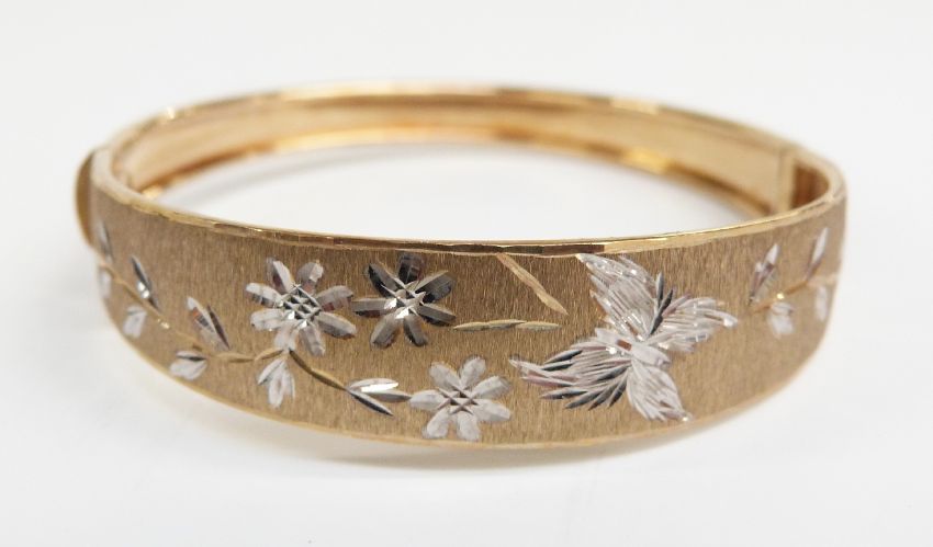 A 9ct gold bangle with foliate design, 9.69g, 5.7 x 5.3cm