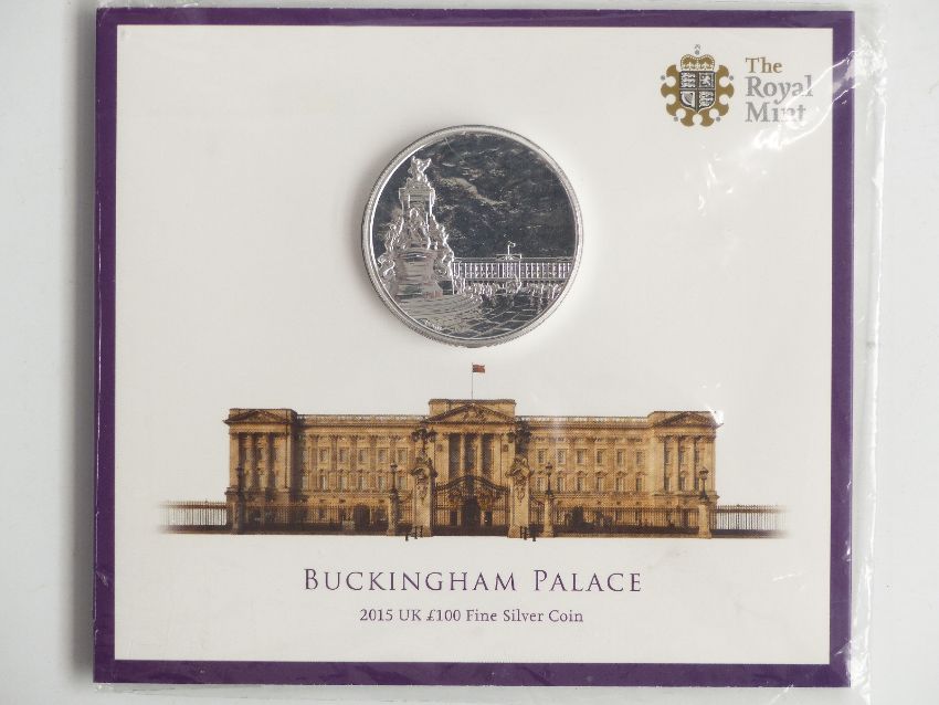 Royal Mint 2015 UK £100 fine silver brilliant uncirculated Buckingham Palace commemorative coin, 62.86g