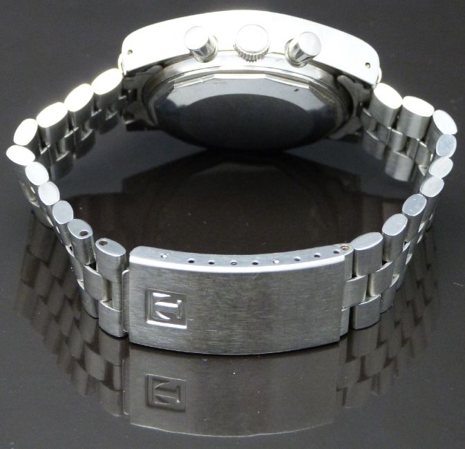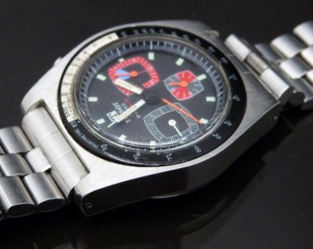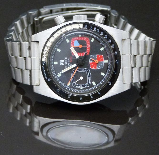 Tissot PR516 gentleman's diver's/yachting chronograph wristwatch ref. 40528-2X with luminous white hands and hour markers, orange centre seconds hand, grey dial, red and blue subsidiary dials, black and white tachymetre bezel, stainless steel case and signed Lemania 17 jewel calibre 873 movement, on stainless steel bracelet, case diameter 36mm, serial number 2797488, with original guarantee.
