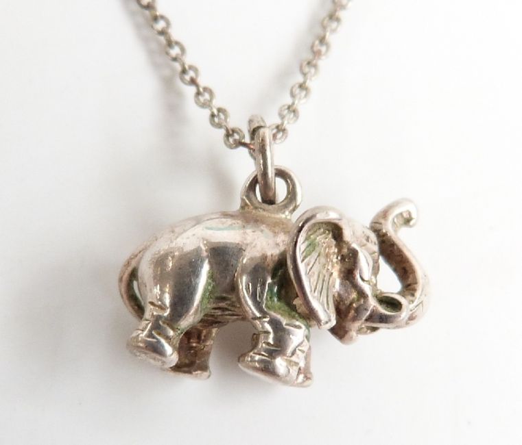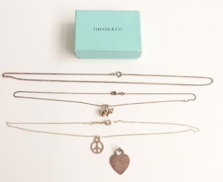 Three necklaces including elephant and peace symbol and a pendant marked 'return to Tiffany & Co.'