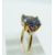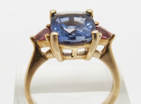 A 9ct gold three stone ring, the central blue paste stone flanked by two pink stones, 5.4g, size S
