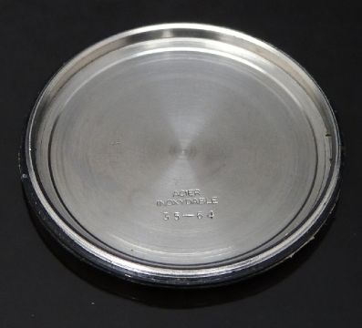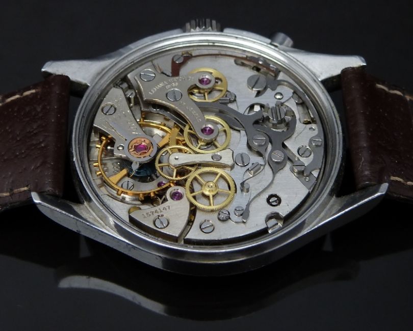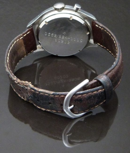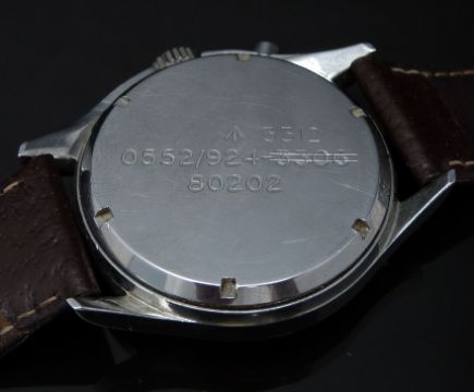 Lemania British Royal Navy nuclear submarine gentleman's single button chronograph wristwatch ref.35-64 with black steel hands, black Arabic numerals, subsidiary dials, ministry broad arrow to the white face, asymmetric stainless steel screw back case marked with military issue marks '0552/924-3312' (3306 crossed out) '80202' and ministry broad arrow and signed 17 jewel calibre 2220 movement, on brown leather strap, case diameter 40mm, serial number 1574147.