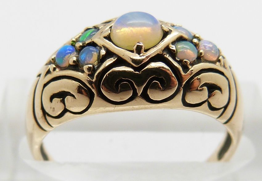 A 9ct gold ring set with opals in a scrolling setting, 3.7g, size L