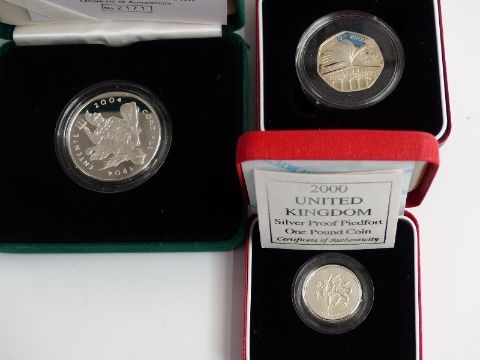 Three silver proof piedfort coins comprising crown, one pound and fifty pence, cased with certificates