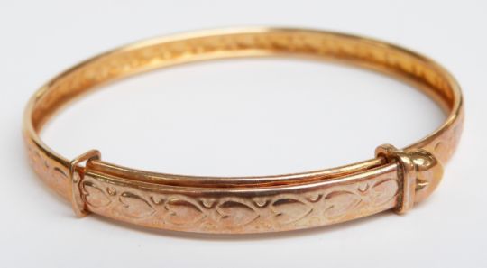 A 9ct gold bangle with heart detail, 5.92g (5.2 x 5.3cm)
