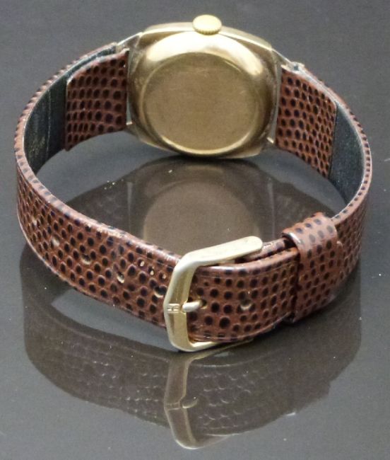 Avia 9ct gold gentleman's wristwatch with inset subsidiary seconds dial, gold hands and Arabic numerals, champagne dial, cushion shaped case and 15 jewel calibre 984 movement, on brown lizard leather strap, case diameter 27.5mm.