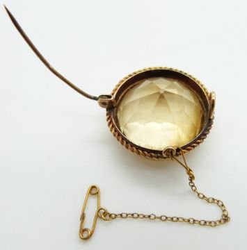 Victorian gold brooch set with a large round cut citrine within a rope twist border, 18.5g, diameter 2.6cm