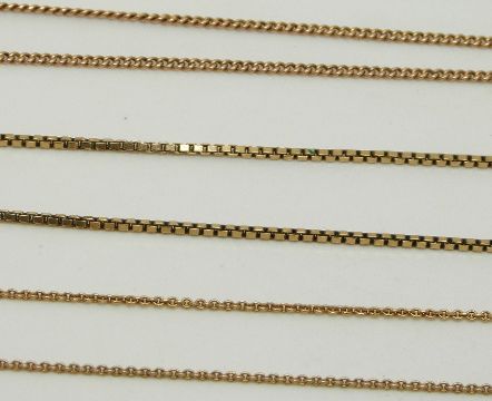 Three gold chains, one box link, 3.5g, 16cm drop, 3.7g, 25cm drop and 1.7g, 18cm drop.