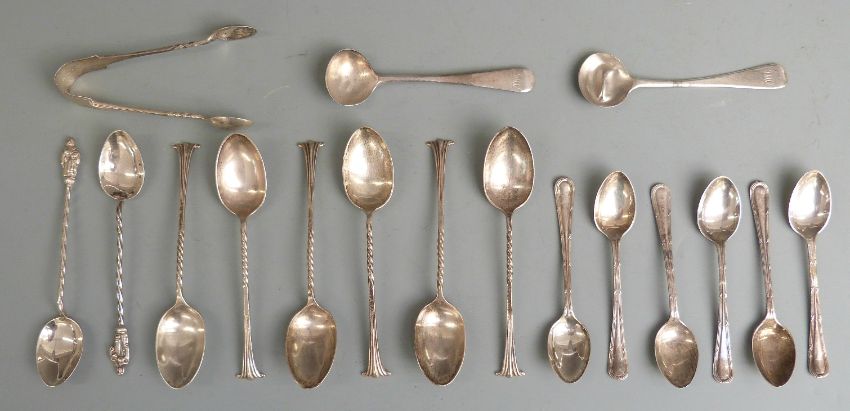 Two sets of six hallmarked silver coffee or teaspoons, one set with tongs together with further hallmarked silver spoons, weight 151g