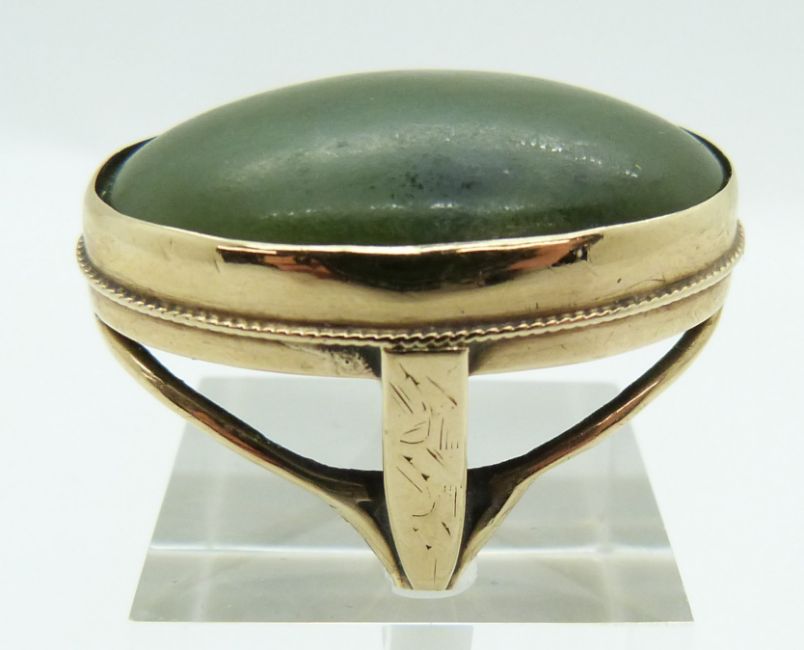 A 9ct gold ring set with a large nephrite jade cabochon, 11.7g, size O