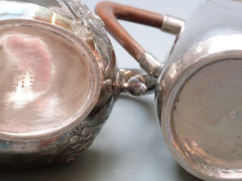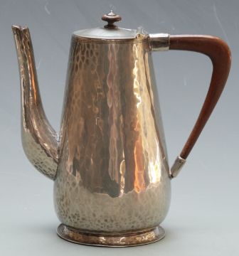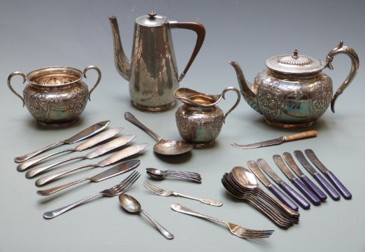 Arts and Crafts hammered tea pot marked JHG, plated three piece teaset and a quantity of plated cutlery