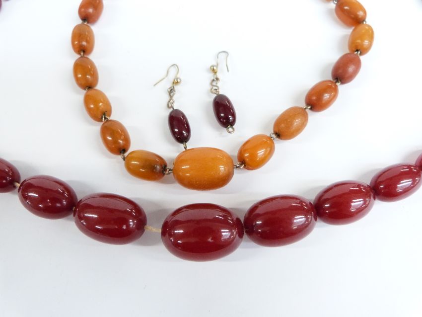 Two amber necklaces, one cherry amber of 47 graduated oval beads the largest 25x17.5mm, 46g with matching earrings the other with 25 graduated oval beads, the largest 19.9x14.4mm.