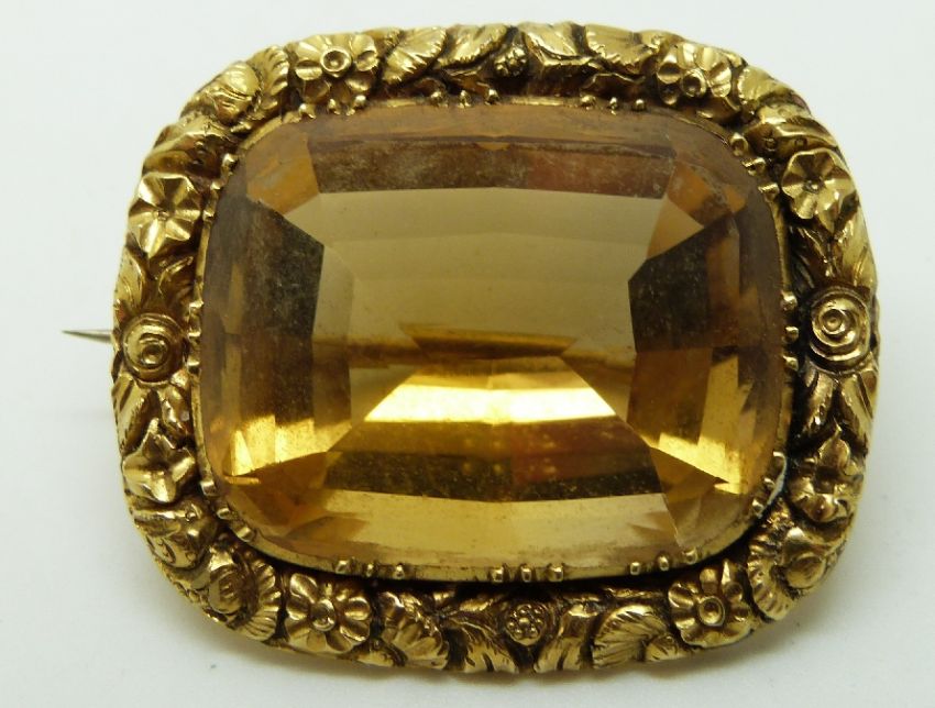 Victorian brooch set with a large mixed cushion cut citrine, in antique jewellery box, 3.5 x 3cm
