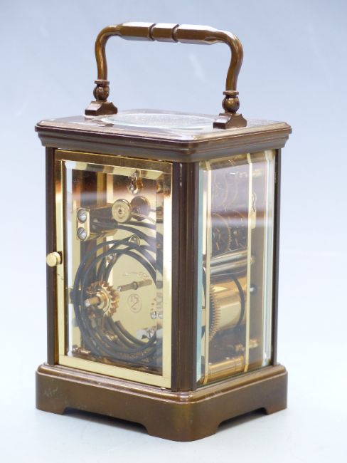 20thC L'Epee French brass carriage clock with enamalled Roman and Arabic dial, blued Breguet style hands and corniche style case, the named movement striking hourly and half hourly on a gong, 13.5cm tall