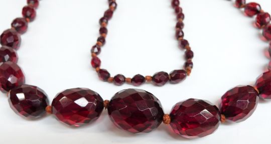 A cherry amber necklace of 65 graduated faceted oval beads, the largest 26.7x21.7mm, 68g.