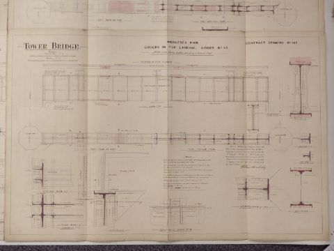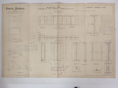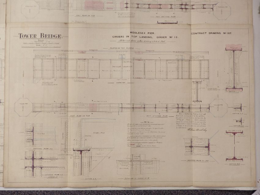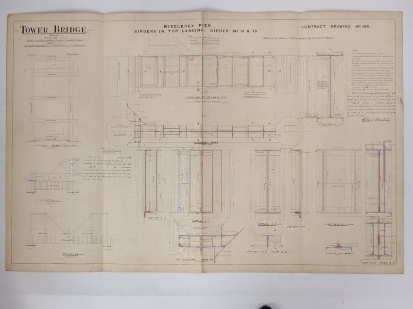 Tower Bridge, London, four Victorian architect's or civil engineering drawings depicting the Middlesex pier girders, three dated 1889, each 64 x 98cm