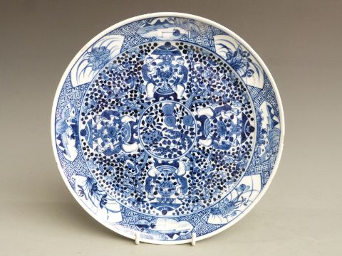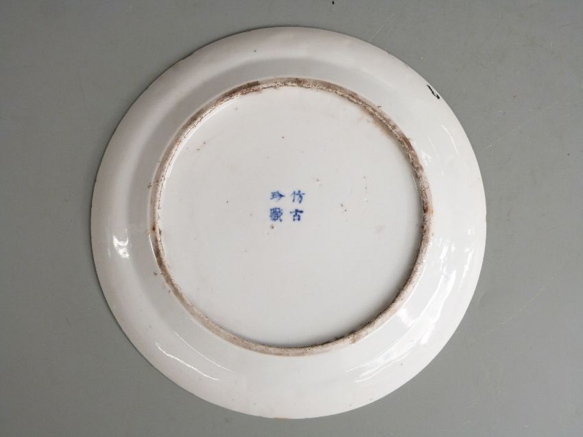 A 19thC Chinese blue and white plate with decoration of figures holding a large vase, four character mark to base, diameter 24cm