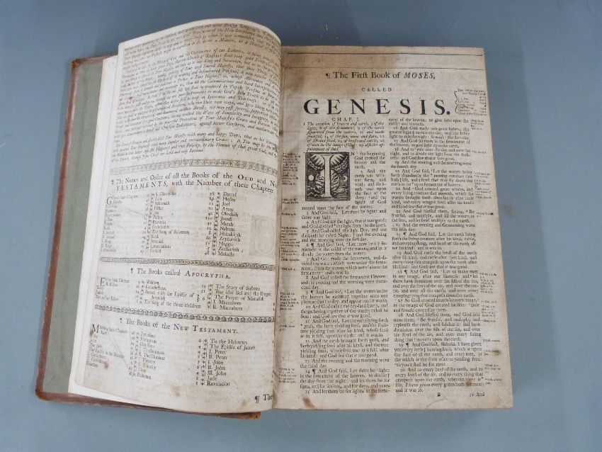 [Scottish Bible] The Holy Bible Containing The Old and New Testaments: Newly Translated Out of the Original Tongues; And with the former Translations Diligently Compared and Revised by His Majesty’s Special Command Appointed to be Read in Churches, published Edinburgh printed by James Watson 1722 with title printed in red & black and decorated initial letters, folio volume bound in full leather with blind stamped decorated edges, ruled bands and gilt lettered spine.