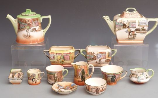 Royal Doulton Dickens Series teaware including two teapots, various sugars, milk jug jugs, cups etc (12), tallest 13cm