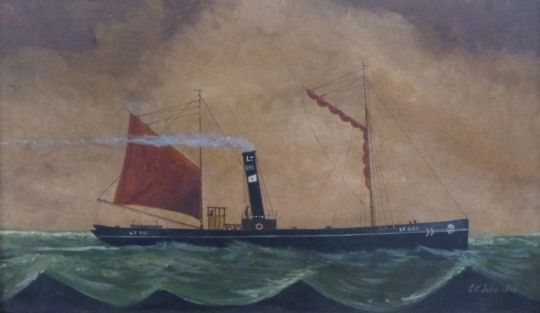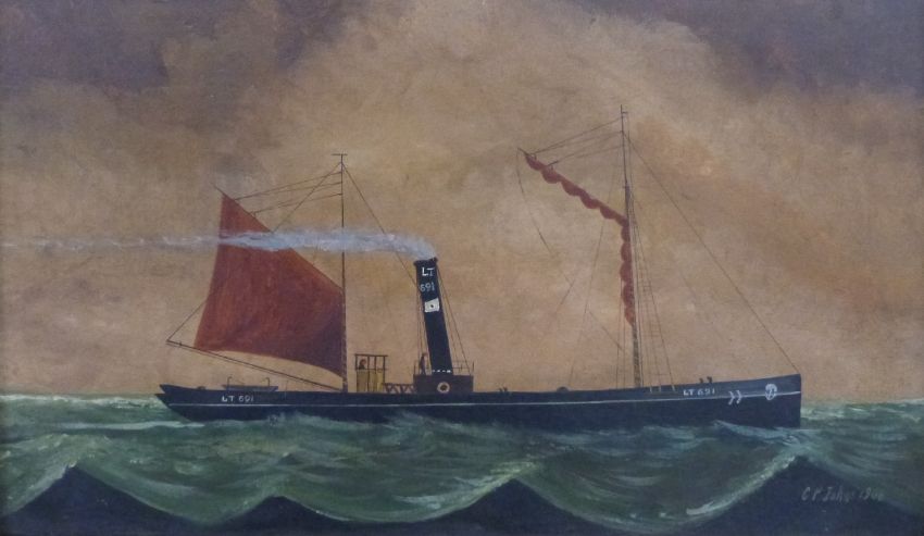C P Johns oil on board of the steam lighter LT 691, signed and dated 1906 lower right, 29 x 49cm