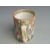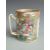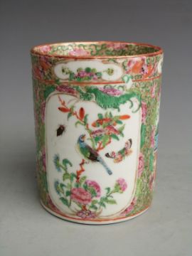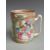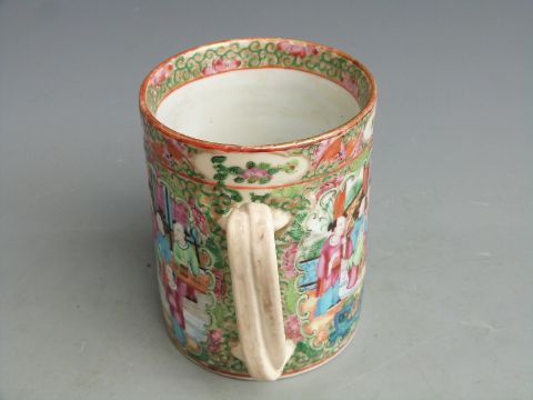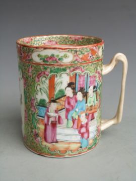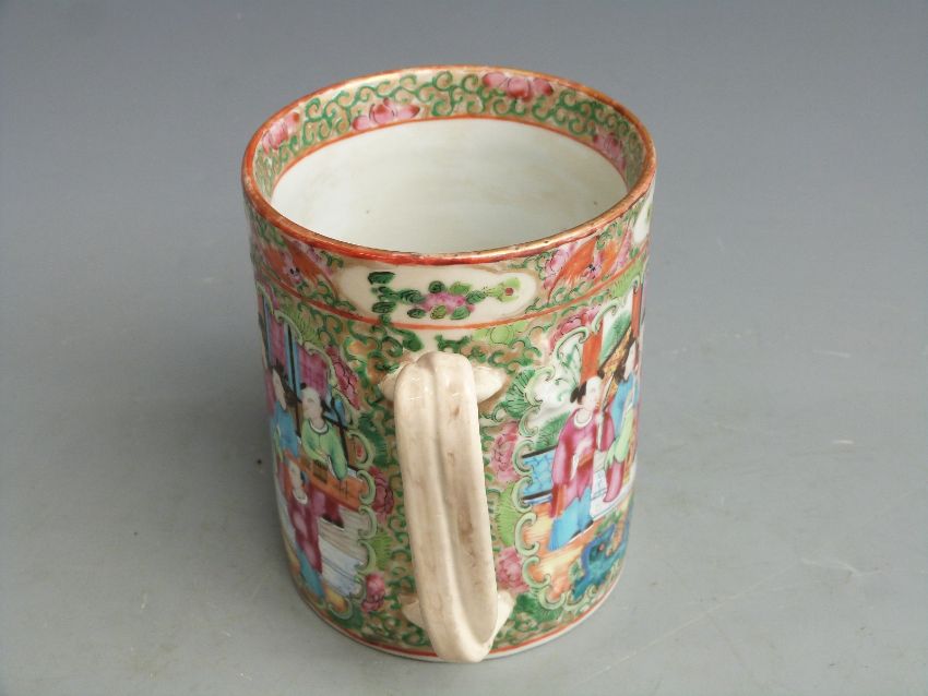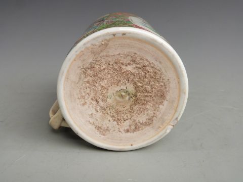 Chinese Canton famille rose tankard with figural court scenes, bird and insect decoration and twisted handle, 12.5cm tall.