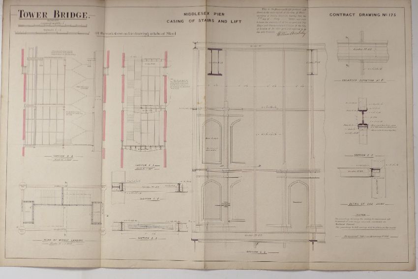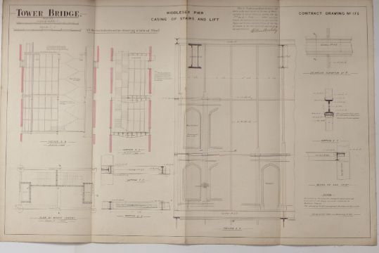 Tower Bridge, London, three Victorian architect's or civil engineering drawings depicting stairwells and pathway girders, all dated 1889, each 64 x 98cm