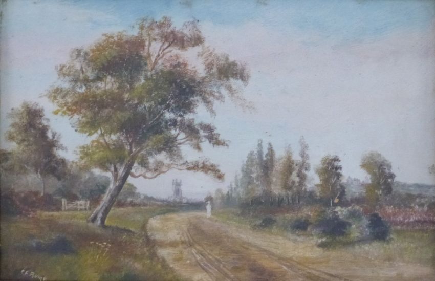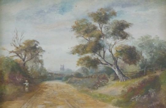 Charles Frederick Rump 19thC pair of oils of figures on a tree lined country lane with church tower, 20 x 30cm