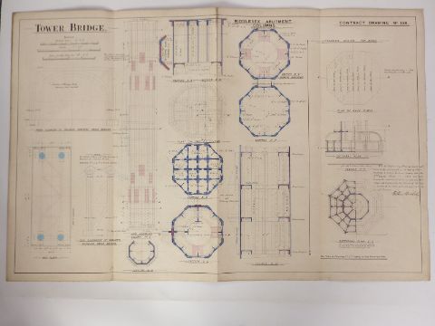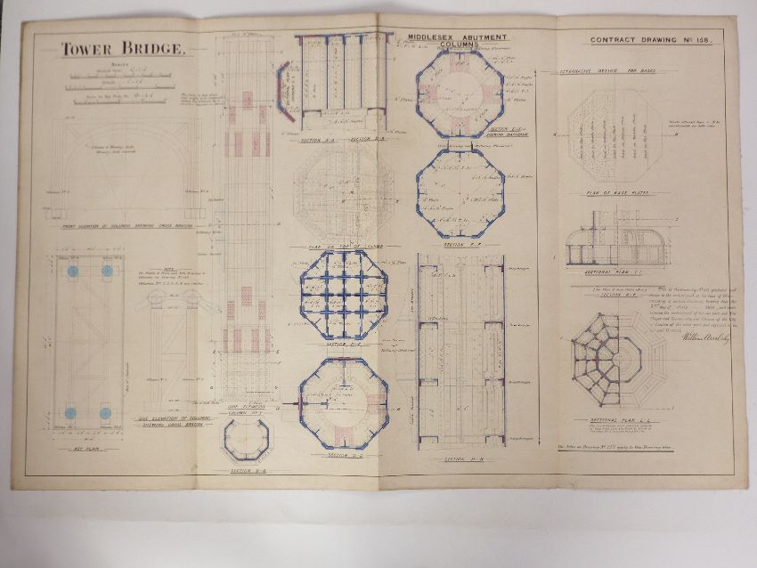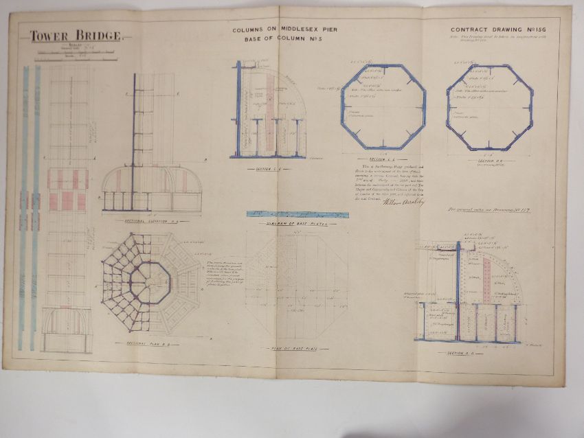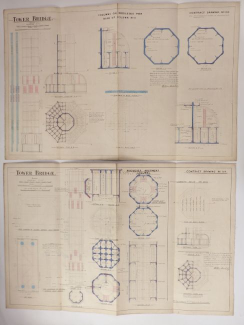 Tower Bridge, London, two Victorian architect's or civil engineering drawings depicting the columns of the Middlesex pier, both dated 1889, each 64 x 98cm
