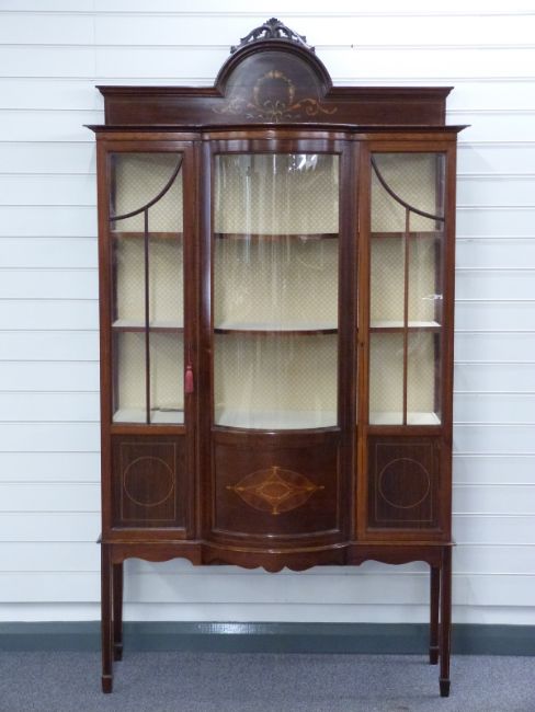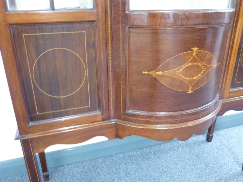 Late 19th or early 20thC bow fronted glazed display cabinet with inlaid decoration W110 x D42 x H172cm