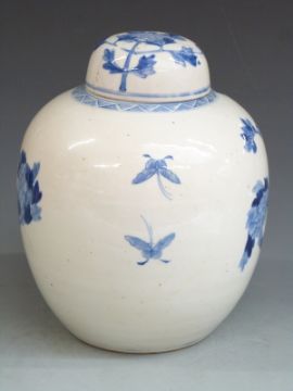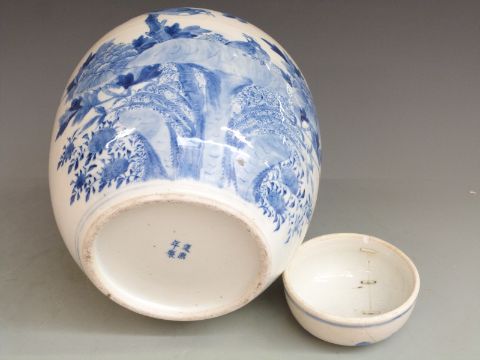 A late 19th/ early 20thC Chinese blue and white lidded pot with Kangxi mark to base, 30cm tall