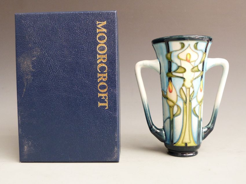 Moorcroft twin handled loving cup decorated with Arum lilies dated 2001, boxed, H15cm