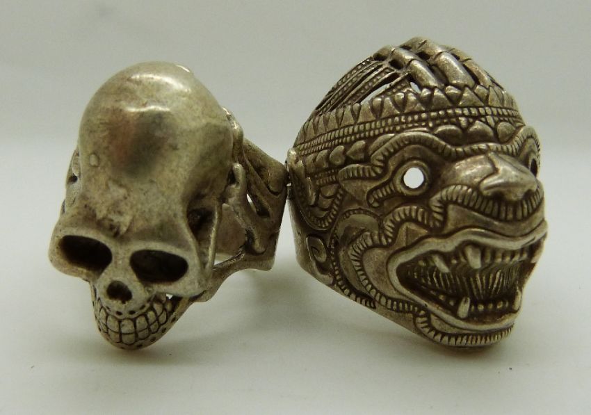 Two oriental style white metal rings, one in the form of a dragon mask, the other as a skull, diameter 4cm