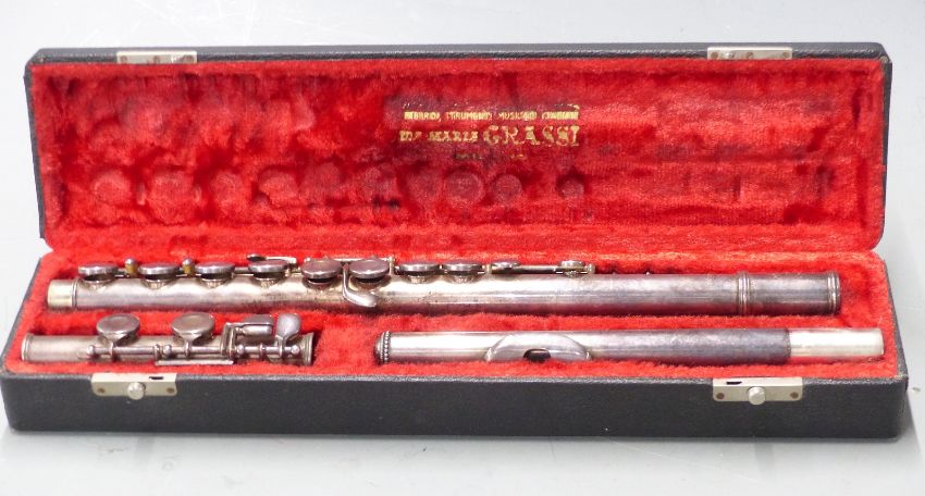Grassi Italian made vintage flute serial number 6452. Prestige model with sterling silver mouth piece, in original case.
