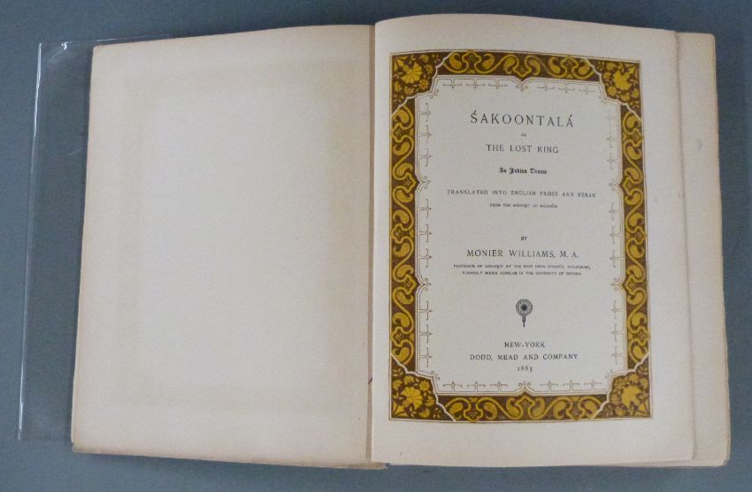 [Colour Printing] Sakoontala or The Lost Ring, an Indian Drama by Monier Williams 1885 limited to 114 copies, each page with decorated border printed in colour and chapter headings, bound in ornate colour decorated covers