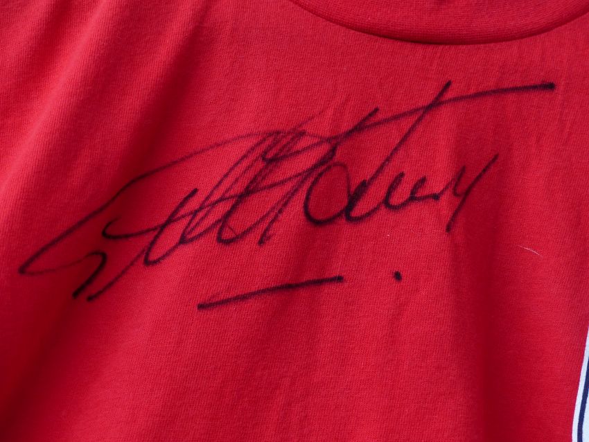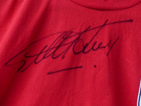 Sir Geoff Hurst signed England short sleeved football shirt with 'Hurst 10' to the back together with a photo of Hurst holding the shirt after signing it.