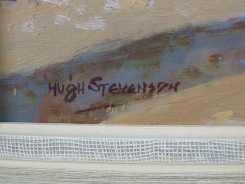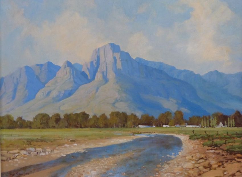 Hugh Stevenson (South African 1910-1956) oil on board river with farm and mountains beyond, signed lower left, 45 x 60cm