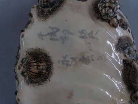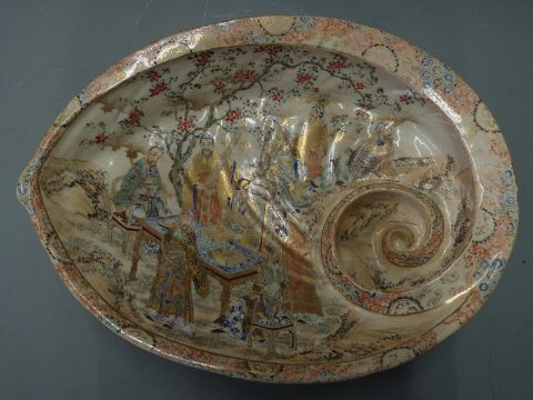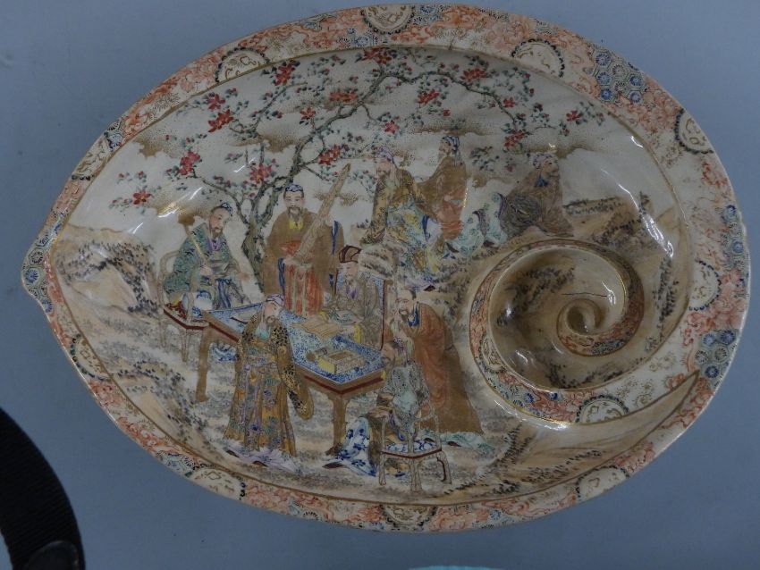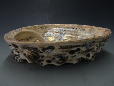 19thC Japanese Satsuma bowl with figural decoration within and applied shell/limpet decoration to the outside, W43 x D31 x H11cm