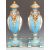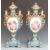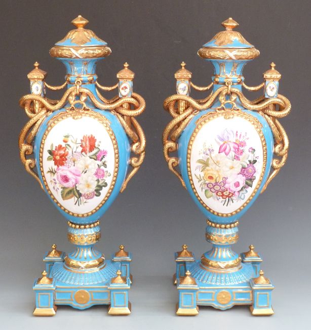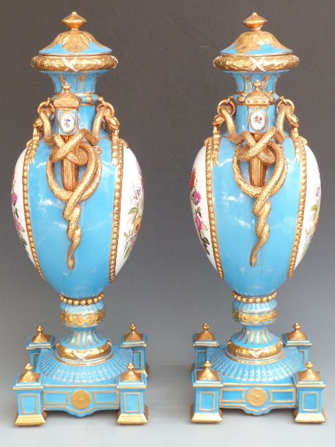 Pair of large porcelain pedestal twin handled covered vases with decorated cartouches of flowers and gilded coiled snake handles, printed Sevres mark to base, H60cm