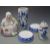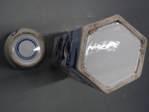 Chinese blue and white lidded vase, two blue and white bases, a Buddha and a Chinese blue and white vase, tallest 24cm