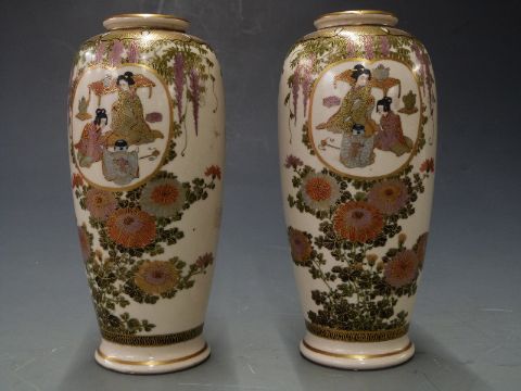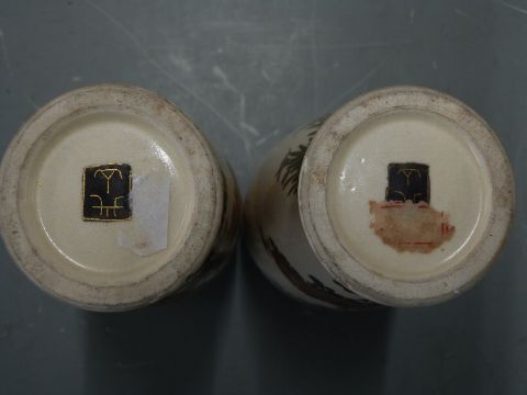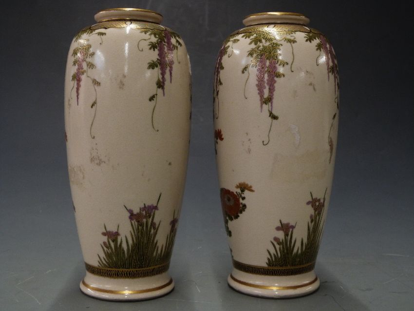A pair of 19th/ 20thC Japanese Satsuma vases with mark to base, 15.5cm tall