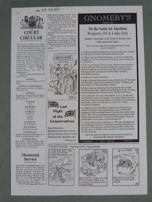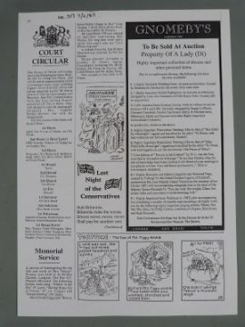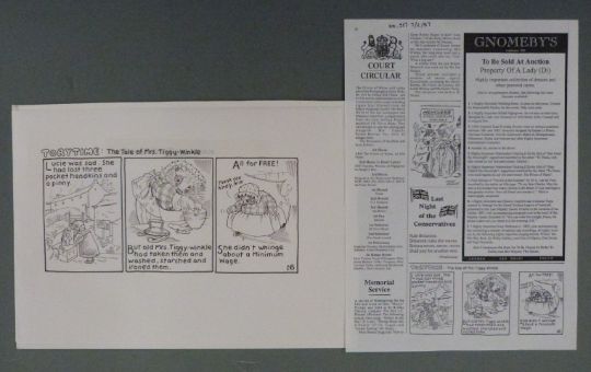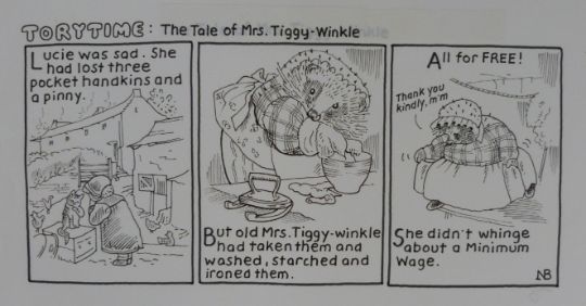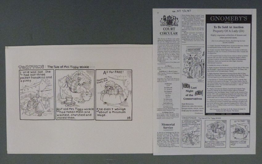 [Beatrix Potter] original pen & ink cartoon by Neil Bennett (cartoonist of the Year 2002) titled “ToryTime” The Tale of Mrs. Tiggy-Winkle in which the hedgehog washes & irons Lucie’s Pinny and Handkins for free “..she didn’t whinge about a minimum wage” signed with initials – and copy of the paper in which it appeared.