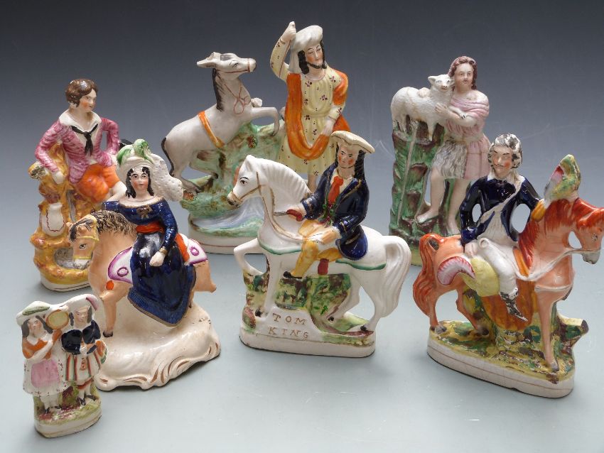 Seven 19thC Staffordshire figures including Tom King, mounted riders etc, tallest 26cm