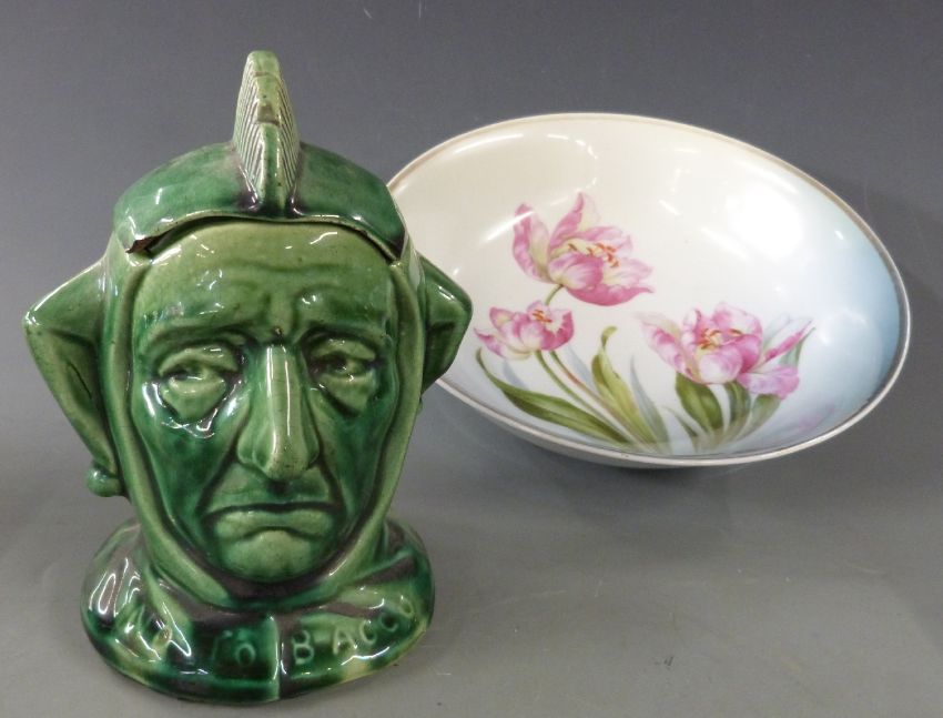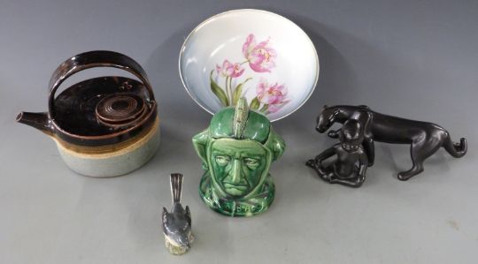 Ulrome figures, studio pottery teapot, Majolica tobacco jar modelled as a jester, Russian hand-decorated dish etc