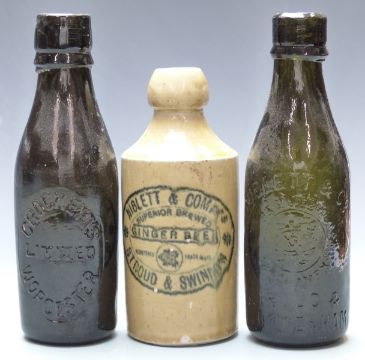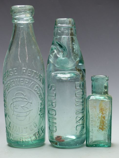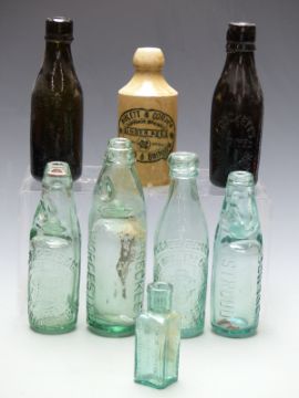Eight various mainly glass bottles including Crockett's Worcester, Brown & Co, Stroud; Stroud Brewery Company; Niblett & Co, Stroud and Cheltenham; Spreckley, Worcester and S Harris & Co, Gloucester