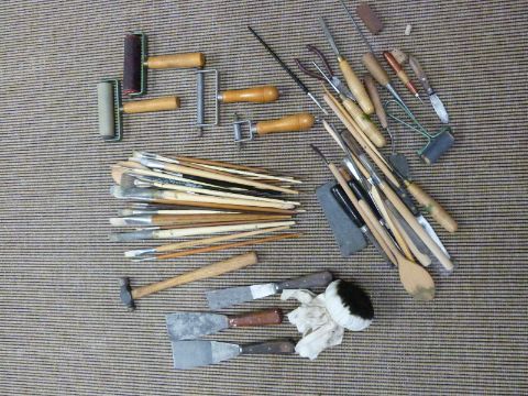 Henry Taylor wood carving chisels, specialist artist's tools and material including pure bristle brushes, ink rollers etc