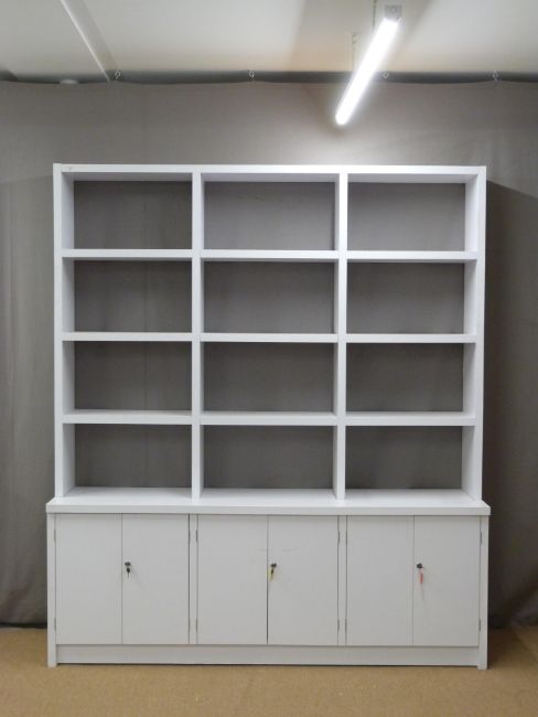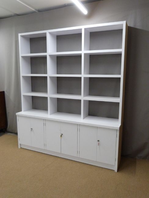 Modern white shelf unit with cupboards below, W200 x D47 x H230cm