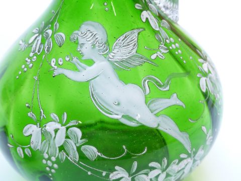 Six pieces of Mary Gregory green glassware all with white enamel decoration, largest 26cm tall