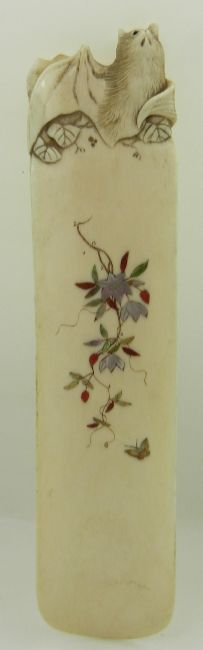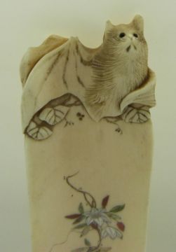 Japanese Meiji period mother of pearl Shibayama ivory shoe horn with carved bat finial, L17cm