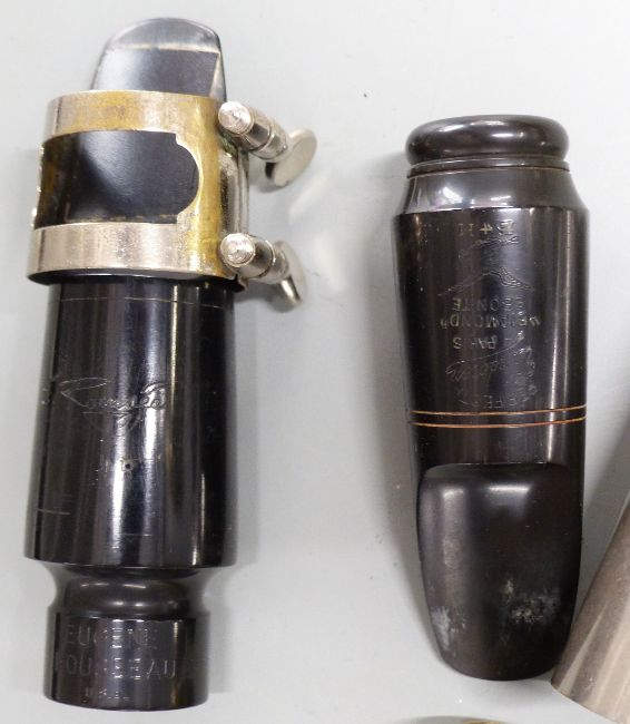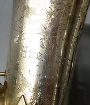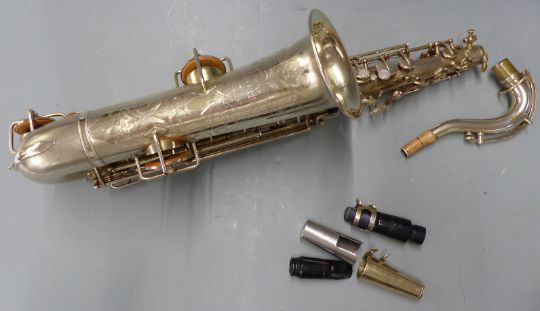 Buescher Truetone low pitch saxophone c1919, silver plated with gold wash to bell, serial no. 49045, with Vandoren Perfecta C mouthpiece, in original hard fitted case with retail label Lyon and Healy. Bought by the vendor from Davey Payne of 'The Blockheads' approximately 30 years ago, who had bought it from the U.S.A. (by repute). The instrument was played on 'Brass Monkey' albums